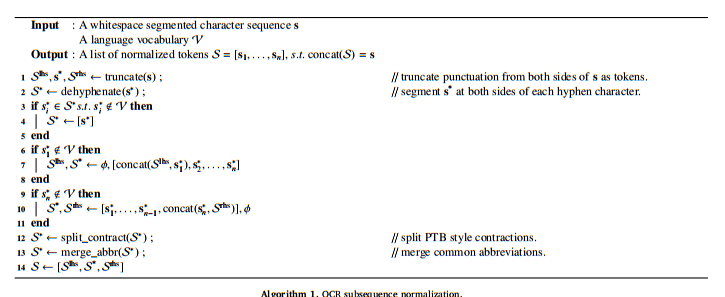to deal with ambiguous word boundaries in noisy ocr text, we propose a two-stage tokenization scheme, which first utilizes a vocabulary to assert fuzzy boundary detection, and then adopts peen treebank conventions to normalize tokens.