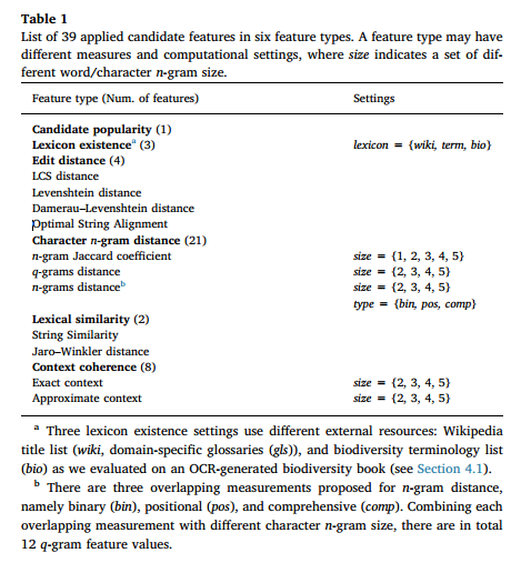 为了广泛地表示单词的特征及其与错误的关系,我们使用以下六种特征类型的语言统计向量对每个选定的候选对象进行了描述,其中包含39个特征值的完整列表如表1所示。